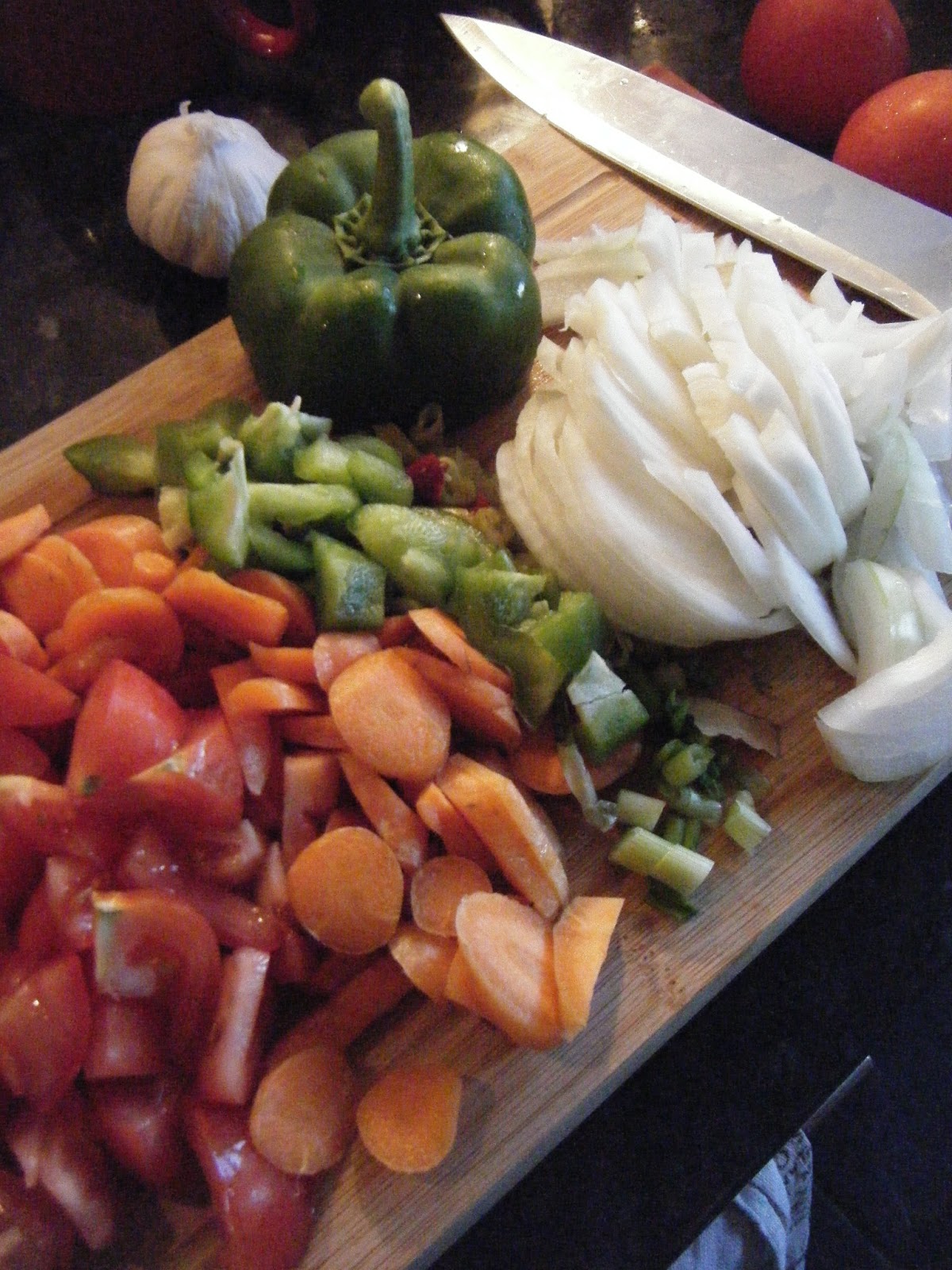 The beef was browned in its own fat for half an hour at a medium and then a low heat, stirring frequently to ensure a thorough browning.The tomatoes carrot, onion and green pepper were added to the mix, followed twenty minutes later by the chopped chestnut mushrooms. Stir-fried for another ten or fifteen minutes, then boiling water was added, plus the beef stock. Simmered under glass for another hour at a low heat.